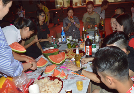跑步結束后,緊接著燒烤活動正式開始,隨著音樂響起,場面十分熱鬧,一片歡聲笑語的。員工們把燒烤桌拼在一起,有的在品者美味的燒烤,有的在玩游戲,有的在開心的交談著,場面溫暖而熱烈。