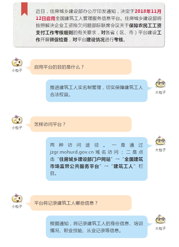 為貫徹落實(shí)《國務(wù)院辦公廳關(guān)于促進(jìn)建筑業(yè)持續(xù)健康發(fā)展的意見》(國辦發(fā)〔2017〕19號(hào)),推進(jìn)建筑工人實(shí)名制管理,切實(shí)保障建筑工人合法權(quán)益,我部決定于2018年11月12日啟用全國建筑工人管理服務(wù)信息平臺(tái)(以下簡稱平臺(tái))?,F(xiàn)將有關(guān)事項(xiàng)通知如下: