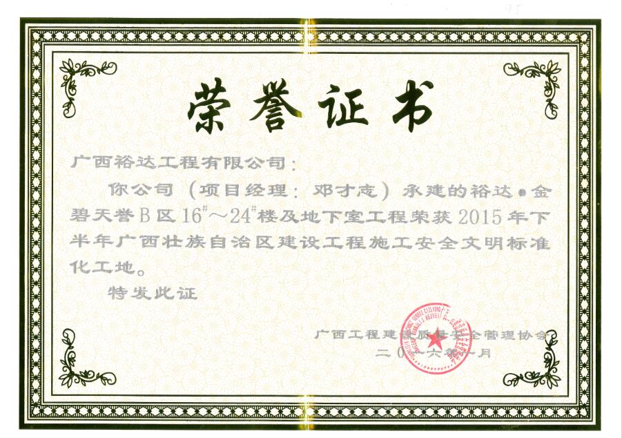 日前,從廣西工程建設(shè)質(zhì)量安全管理協(xié)會(huì)傳來喜訊,裕達(dá)·金碧天譽(yù)B區(qū)16#-24#樓及地下室工程榮獲2015年下半年“廣西壯族自治區(qū)建設(shè)工程安全文明標(biāo)準(zhǔn)化工地”。