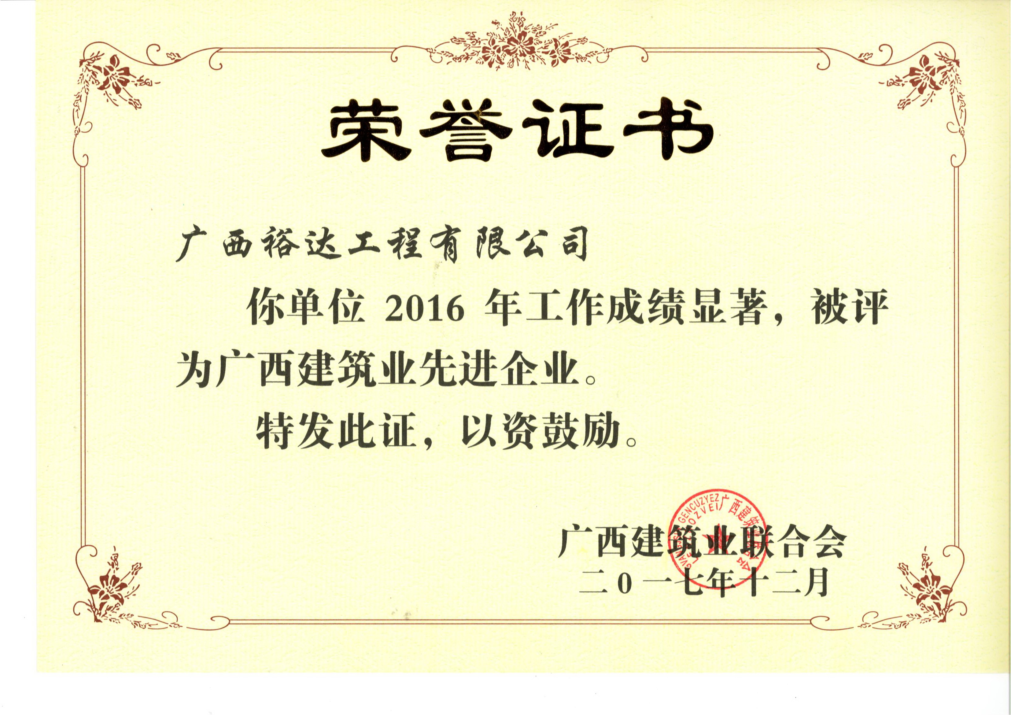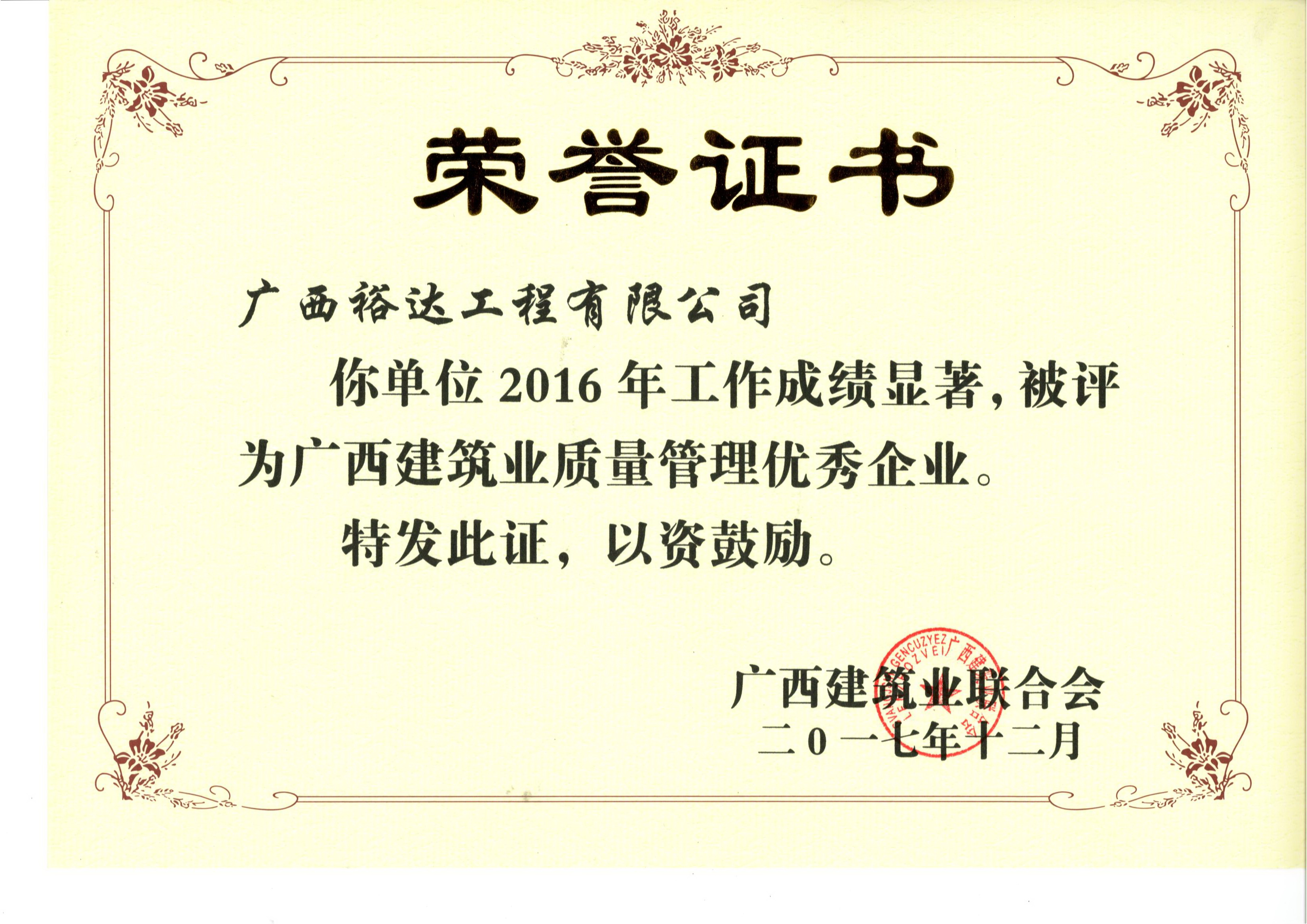 12月11日,廣西建筑業(yè)聯(lián)合會2017年年會暨表彰大會在南寧召開,廣西裕達工程有限公司派代表參加會議,共喜獲2016年度8項自治區(qū)建筑業(yè)榮譽。