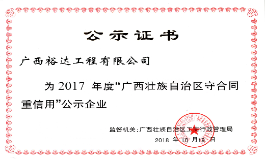 在自治區(qū)工商局近期授予的“2017年度廣西壯族自治區(qū)守合同重信用企業(yè)”榮譽(yù)稱號(hào)的企業(yè)當(dāng)中,廣西裕達(dá)工程有限公司名列其中,這是工程公司首次獲此殊榮。