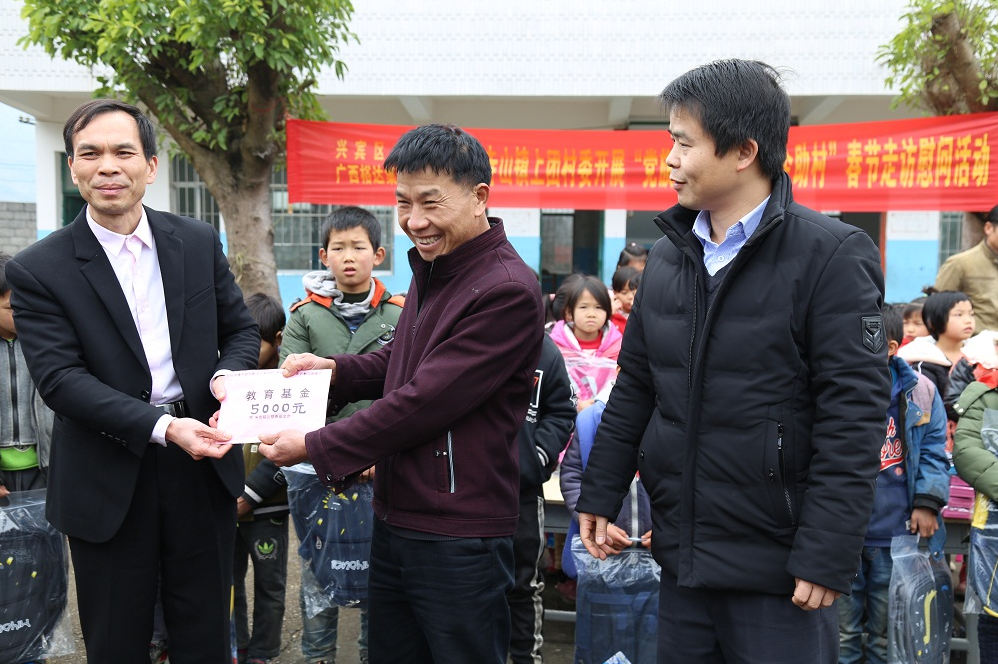 與興賓區(qū)委辦等一行在上團(tuán)村小學(xué)捐贈(zèng)教育基金及書(shū)包等學(xué)習(xí)用品
