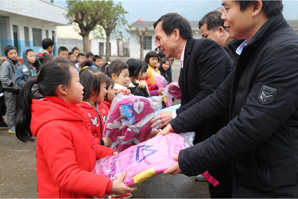 集團(tuán)黨支部書(shū)記謝家偉與興賓區(qū)委辦副主任楊杰為學(xué)生送去書(shū)包