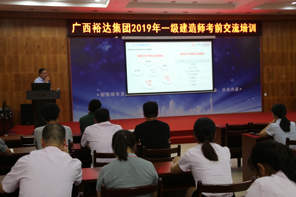 為全面貫徹裕達(dá)集團“育人才”的經(jīng)營指導(dǎo)思想,幫助考生做好考前復(fù)習(xí)準(zhǔn)備,全力以赴做好備考。集團人力資源部特邀請地產(chǎn)八公司副總經(jīng)理胡斌、廣西裕達(dá)工程有限公司副總工程師左居頑兩位講師進(jìn)行考試經(jīng)驗分享以及考前培訓(xùn)指導(dǎo),培訓(xùn)內(nèi)容包含建筑、市政兩個專業(yè)全科目。培訓(xùn)于8月20日晚上19點在集團七樓大會議室順利開展,共有30人已報名9月一級建造師考試的員工參加了本次培訓(xùn)。