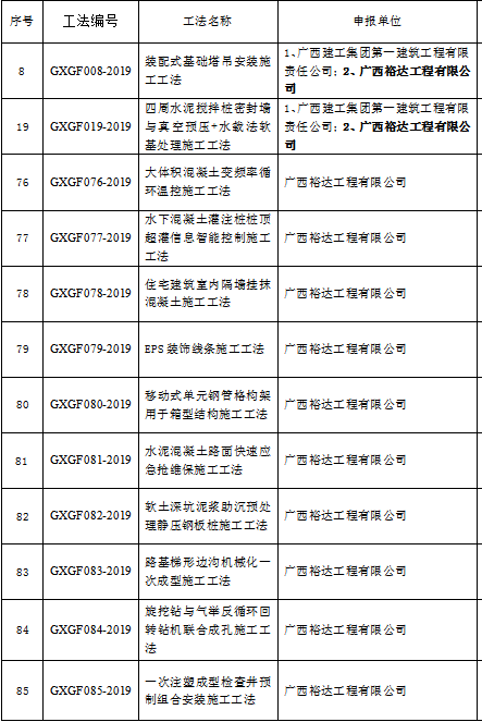 近日,從廣西建筑業(yè)聯(lián)合會(huì)發(fā)布的《關(guān)于公布2019年廣西壯族自治區(qū)級(jí)工程建設(shè)工法名單的通知》獲悉,工程公司申報(bào)的“大體積混凝土變頻率循環(huán)溫控施工工法”等10項(xiàng)自主研發(fā)工法以及“裝配式基礎(chǔ)塔吊安裝施工工法”等4項(xiàng)合作研發(fā)工法,被評(píng)為2019年廣西壯族自治區(qū)級(jí)工程建設(shè)工法。獲評(píng)數(shù)量超過(guò)歷年最高紀(jì)錄3倍,也使工程公司本年度的工法業(yè)績(jī)?cè)谠谢A(chǔ)上獲得重大突破。