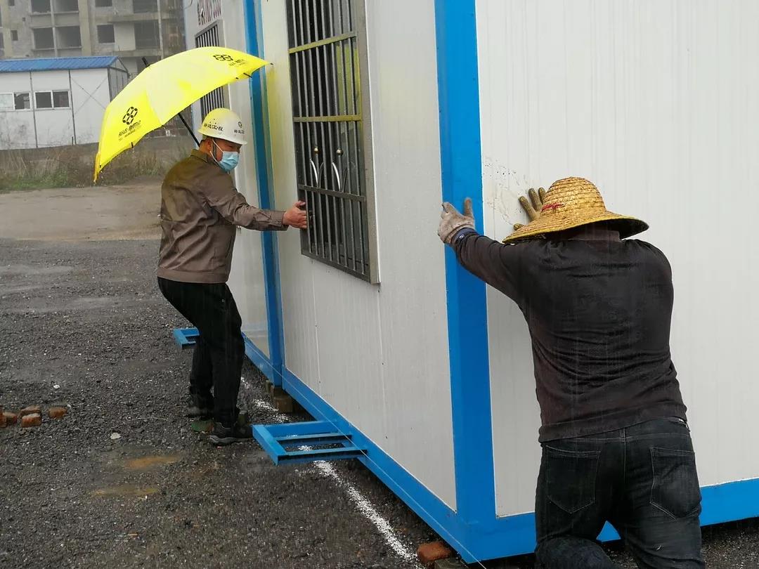 2月11日,在接到搶建任務(wù)后,裕達控股集團董事長鄧亞保第一時間組建領(lǐng)導(dǎo)小組,于當(dāng)日上午落實了工地清理、活動板房預(yù)定、混凝土供應(yīng)、水電材料供應(yīng)等前期準備工作。2月12日上午7點,雖然天空不作美下起了小雨,但所有參建人員全部到位,科學(xué)分工、參與劃線、吊裝板房、水電到位……每一個參建人員忙碌的身影,都彰顯著裕達集團的承諾和使命。