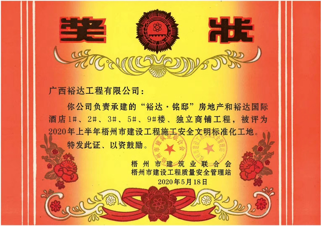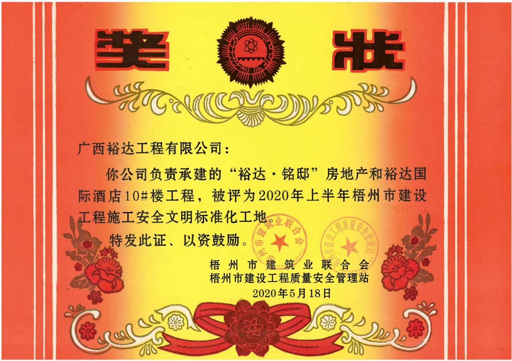 2020年5月18日,藤縣裕達·銘邸和裕達國際酒店10#樓工程、1#、2#、3#、5#、9#、獨立商鋪工程喜獲由梧州市建筑業(yè)聯合會和梧州市建設工程質量安全管理站組織評選的2020年上半年梧州市建設工程施工安全文明標準化工地。