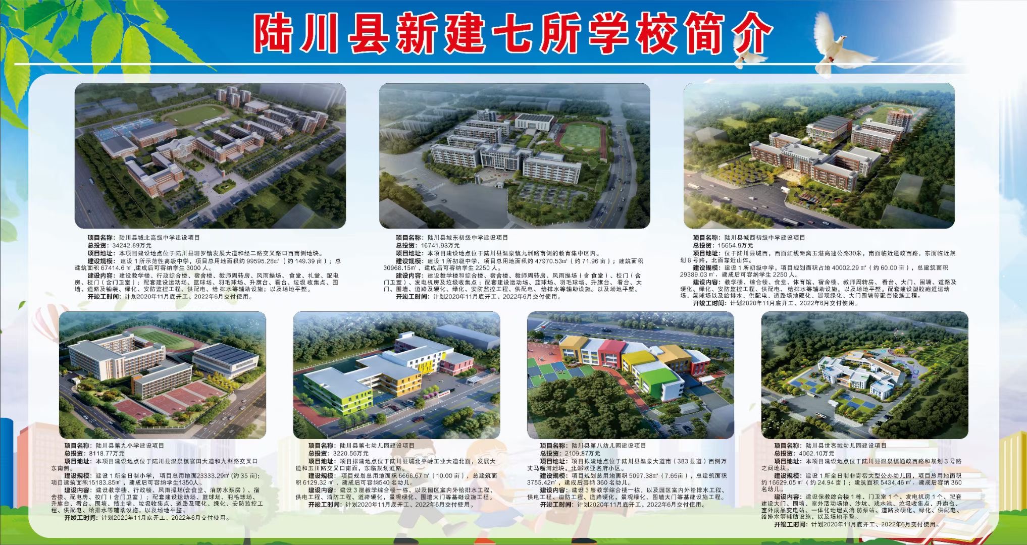 據(jù)悉,陸川縣新建七所學(xué)校項(xiàng)目包括七個子項(xiàng)目,即新建1所高中、2所初中、1所小學(xué)和3所幼兒園(包括陸川縣城北高級中學(xué)、陸川縣城東初級中學(xué)、陸川縣城西初級中學(xué)、陸川縣第九小學(xué)、陸川縣第七幼兒園、陸川縣第八幼兒園、陸川縣世客城幼兒園),總建筑面積約15.87萬㎡,項(xiàng)目估算總投資約8.42億元,工期為730天。