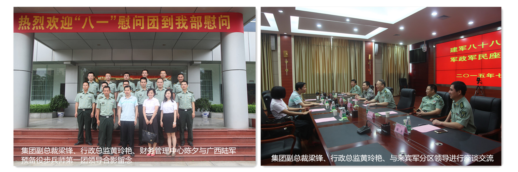 幸福不忘擁軍,安定不忘國防。今年是中國人民抗日戰(zhàn)爭暨世界反法西斯戰(zhàn)爭勝利70周年及建軍88周年。2015年7月31日,在“八一”建軍節(jié)到來之際,我集團(tuán)副總裁梁鋒與行政總監(jiān)黃玲艷先后走訪慰問了廣西陸軍預(yù)備役步兵師第一團(tuán)、中國人民解放軍廣西來賓市軍分區(qū)、武警來賓市消防支隊(duì)和武警來賓市支隊(duì)的官兵,代表集團(tuán)總裁鄧亞保及全體員工向他們送去節(jié)日的祝福和誠摯的問候,集團(tuán)財務(wù)管理中心副總經(jīng)理陳汐、行政管理中心行政部副經(jīng)理覃婷婷陪同慰問。
