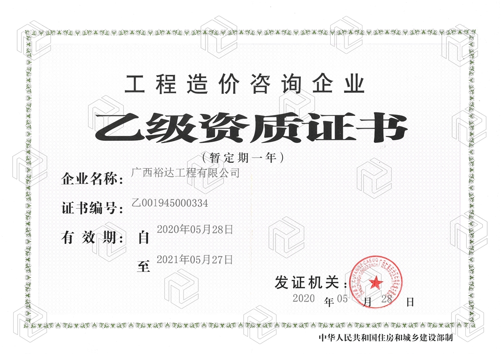 近日,經(jīng)自治區(qū)住房和城鄉(xiāng)建設(shè)廳的審核批準(zhǔn),公司喜獲“工程造價(jià)咨詢企業(yè)乙級(jí)資質(zhì)(暫定一年)”。