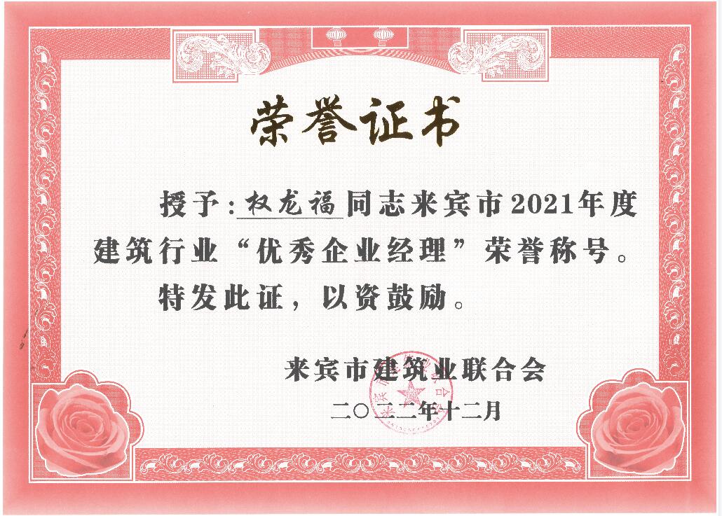 來賓市住房和城鄉(xiāng)建設(shè)局對來賓市建筑行業(yè)2021年度的先進集體和優(yōu)秀個人進行表彰,工程公司獲“來賓市建筑業(yè)先進企業(yè)”榮譽,公司總經(jīng)理權(quán)龍福還被評為“來賓市建筑業(yè)優(yōu)秀企業(yè)經(jīng)理”,公司徐海兵等8位員工被評為“來賓市建筑業(yè)優(yōu)秀建造師”;公司胡海深等8位員工被評為“來賓市建筑業(yè)優(yōu)秀安全員”。這些榮譽是公司全體員工一直以來辛勤耕耘和默默無聞奉獻的結(jié)果以及肯定,是工程公司綜合實力不斷提升和行業(yè)良好信譽的再次體現(xiàn),顯示工程公司得到社會和同行的認可,必將“裕達品牌”的影響力和競爭力提上新的臺階。