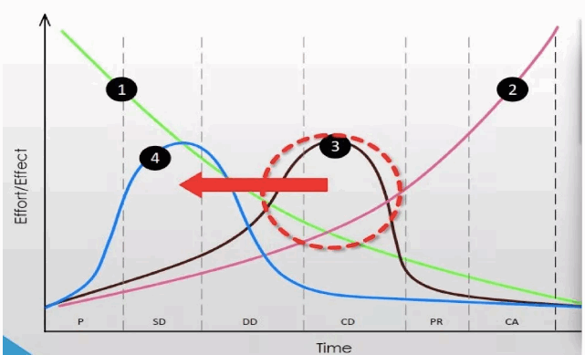在麥克利米曲線圖中,橫軸代表時間,縱軸表示努力/成果。曲線1代表影響成本和功能特性的能力隨著階段的進(jìn)行而逐漸走弱,曲線2代表設(shè)計變更的費(fèi)用隨著階段的推進(jìn)而逐步增多。曲線3代表著我們當(dāng)前傳統(tǒng)的設(shè)計過程,即在擴(kuò)初設(shè)計及施工圖階段進(jìn)行大量設(shè)計變更,而曲線4則代表最優(yōu)選的設(shè)計過程,即大多數(shù)設(shè)計在設(shè)計前期及方案設(shè)計中完成,完成于擴(kuò)初設(shè)計階段。而世界建筑業(yè)的主流的變更軌跡,正是從曲線3向曲線4的過渡。