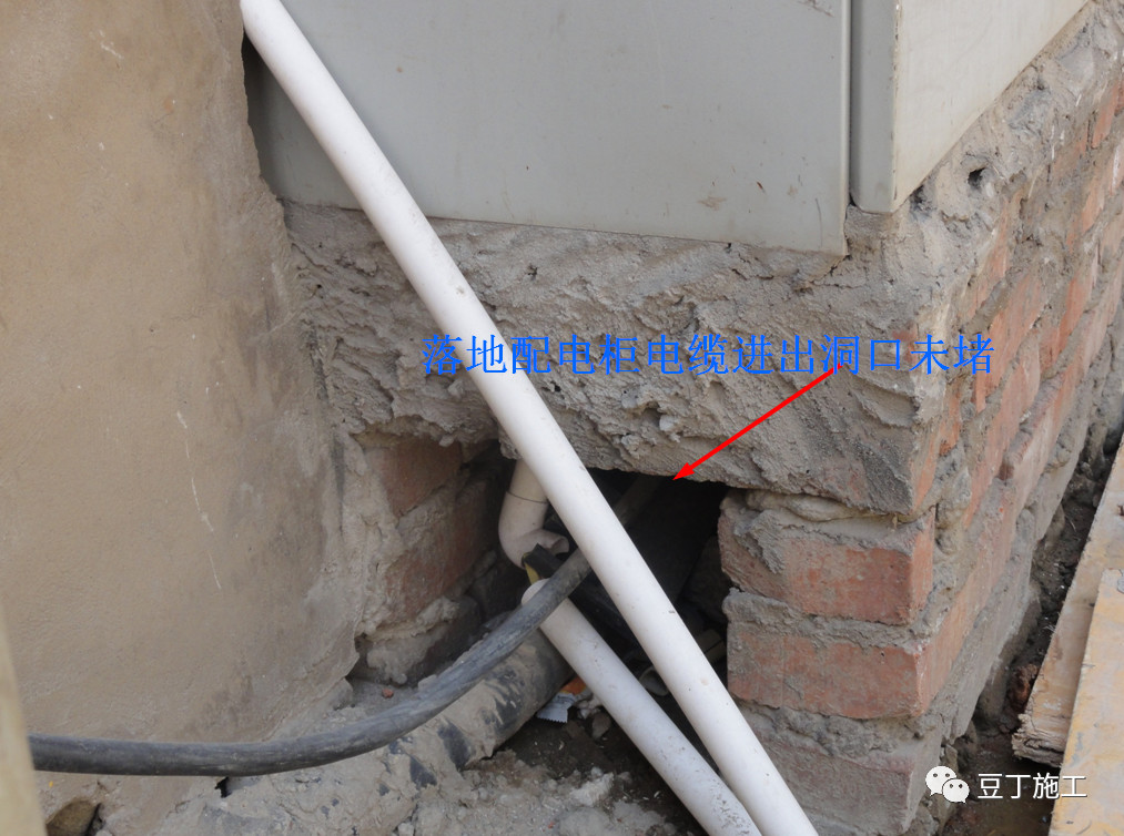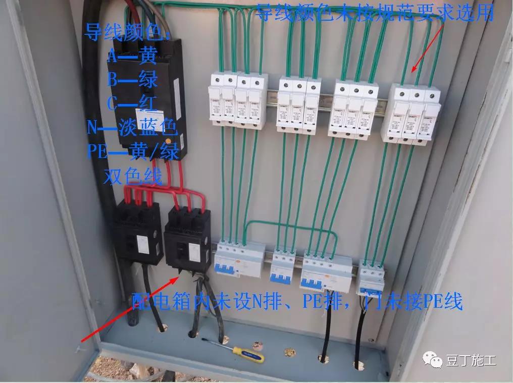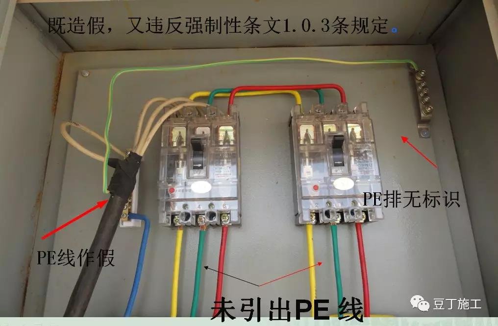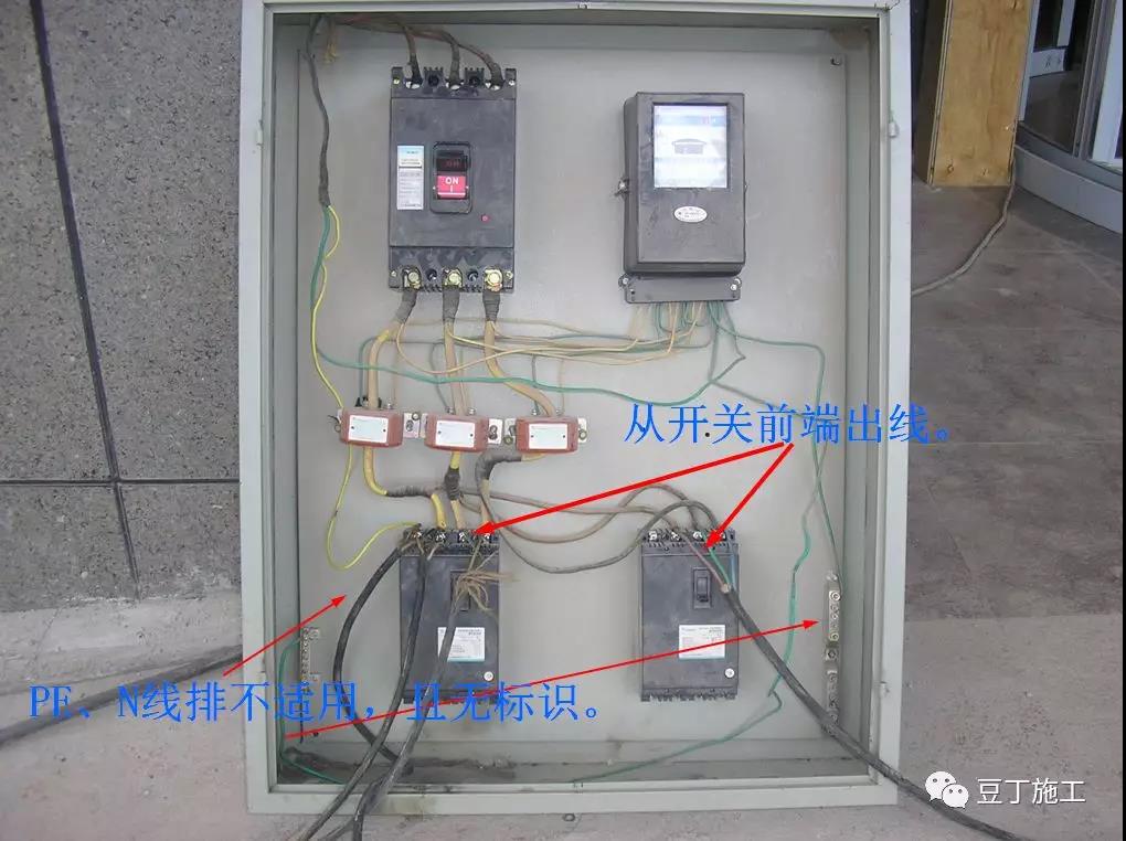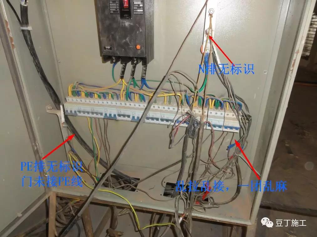 9、PE線、N線從開關箱內引出不規(guī)范。不是按要求從PE、N端子板引出,而是象蜘蛛網一樣互相繞接后引出,亂拉亂接。違反強制性條文8.1.11條規(guī)定。