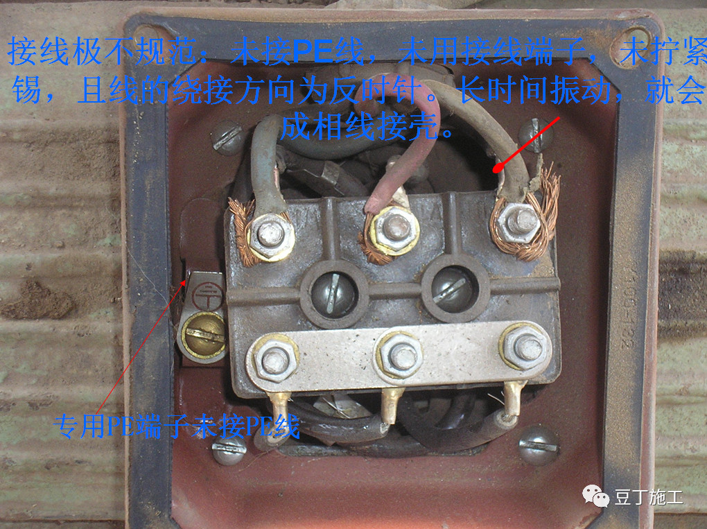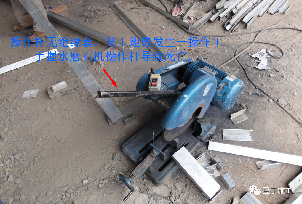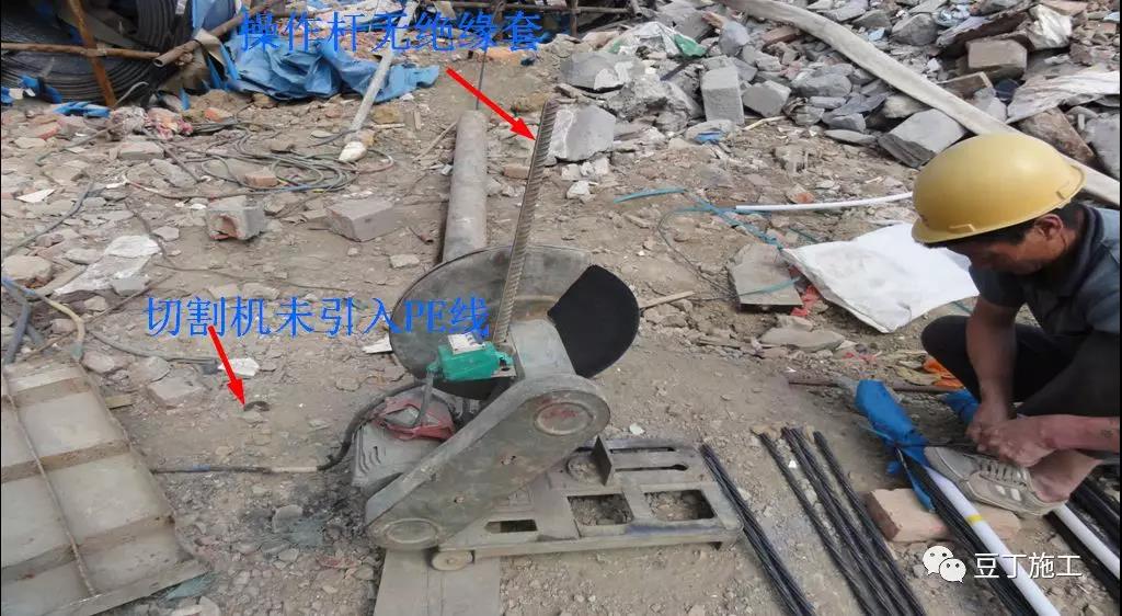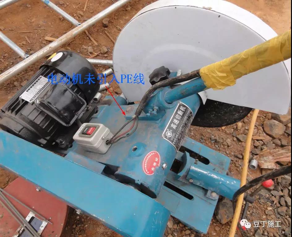 3、施工現(xiàn)場的施工機具,如電焊機、對焊機、碘鎢燈等外殼不接PE線;鋼筋彎曲機、鋼筋剪切機、切割機、臺鉆、打氣泵等電動機的接線盒內的專用PE端子95%以上不接PE線,而且多數(shù)的操作把手無絕緣套。這是最普遍、最嚴重地違規(guī)。
