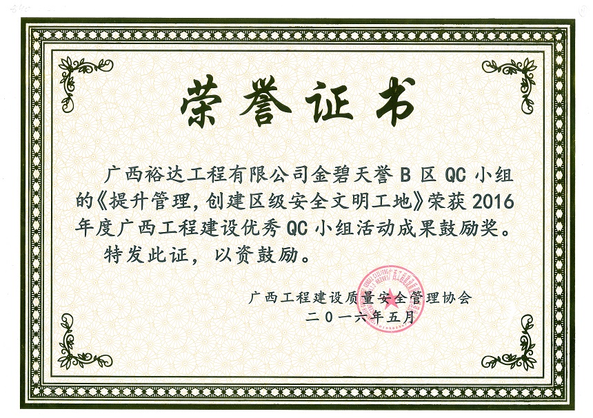 下一篇:2016年度廣西工程建設(shè)優(yōu)秀QC小組活動(dòng)成果鼓勵(lì)獎(jiǎng)《提高現(xiàn)澆結(jié)構(gòu)模板安裝合格率》-綠水仙城中央城市廣場